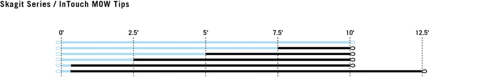 The Heavy MOW Tips feature T-14, with a sink rate of 9" per second, for the sinking material. Each of these tips has either a light blue floating section, or if full sinking are a dark blue color, for easy identification. The Heavy MOW Tips are designed for the large flies and are ideal for Skagit lines of 575 grains and more. There are six unique tips that make up the series.